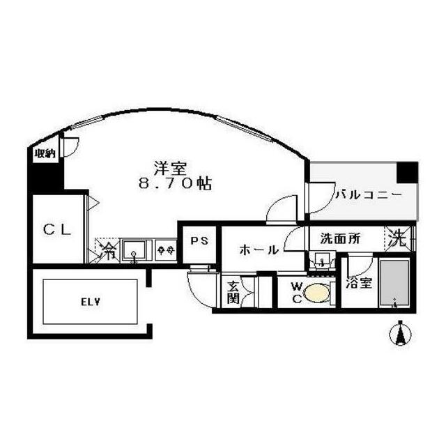 | 間取り | ワンルーム(洋室8.7) | 主要採光面 | 北 |